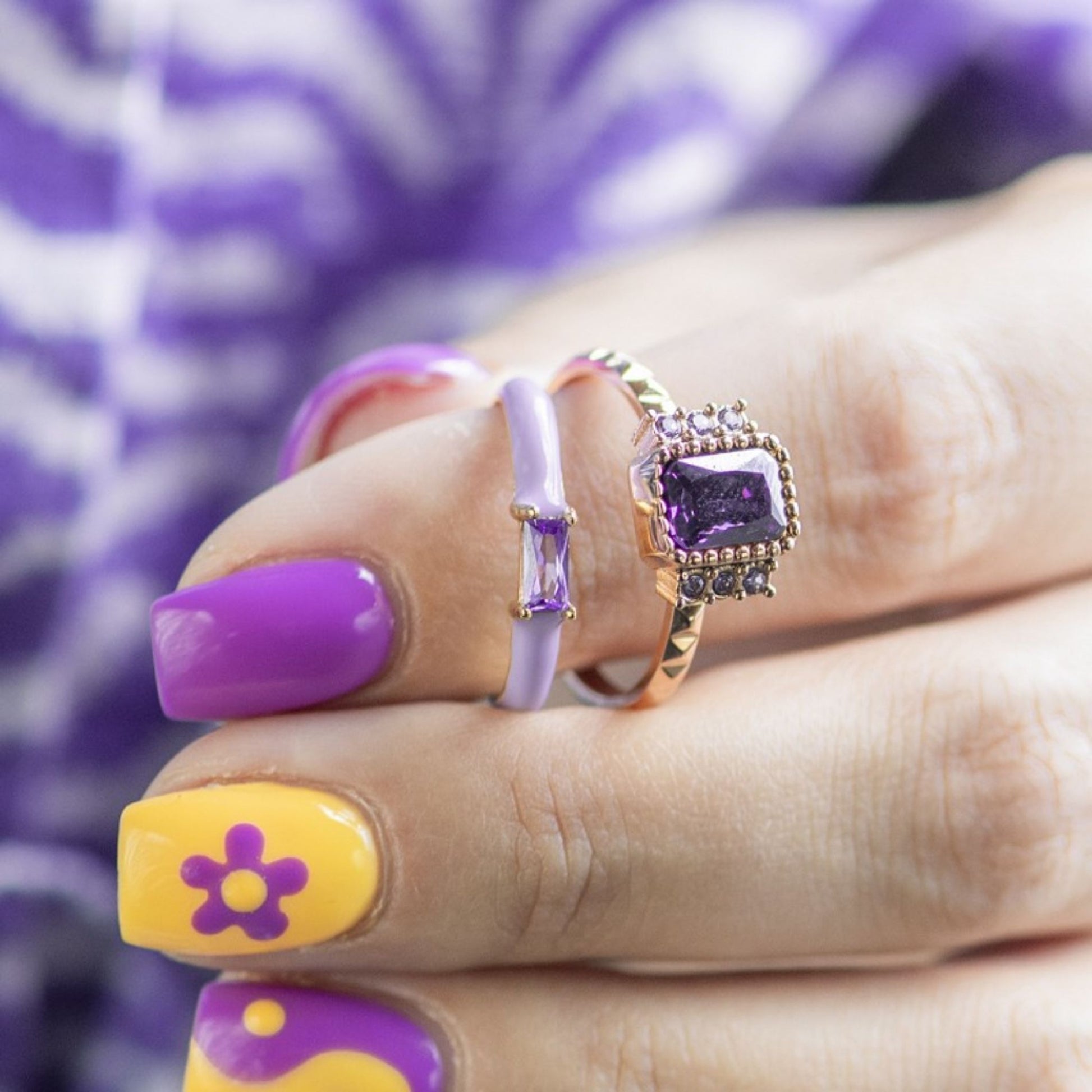 De Miracle Tanzanite Ring straalt elegantie uit met een prachtige rechthoekige tanzanite-kleurige zirconia steen, omringd door fonkelende kleine steentjes. De ringband heeft een subtiel bewerkt design, wat zorgt voor een extra verfijnde uitstraling.