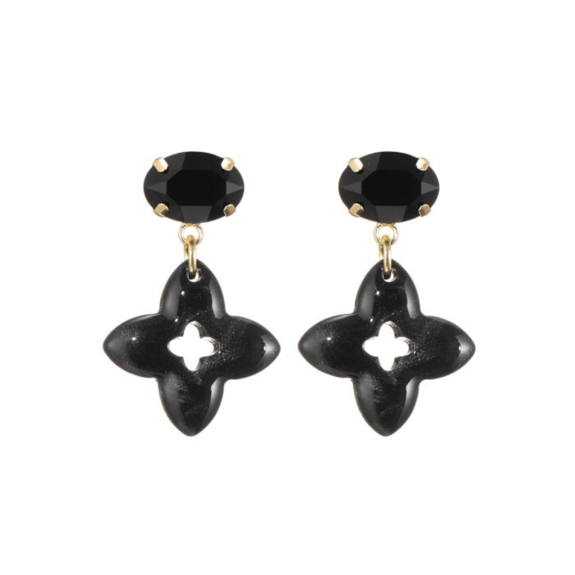 Deze elegante Clover Dangle oorbellen in zwart combineren een sprankelende zwarte steen met een stijlvolle klaverhanger. Het tijdloze design en de subtiele gouden details maken ze perfect voor zowel een chique avondlook als een stoere dagelijkse outfit.