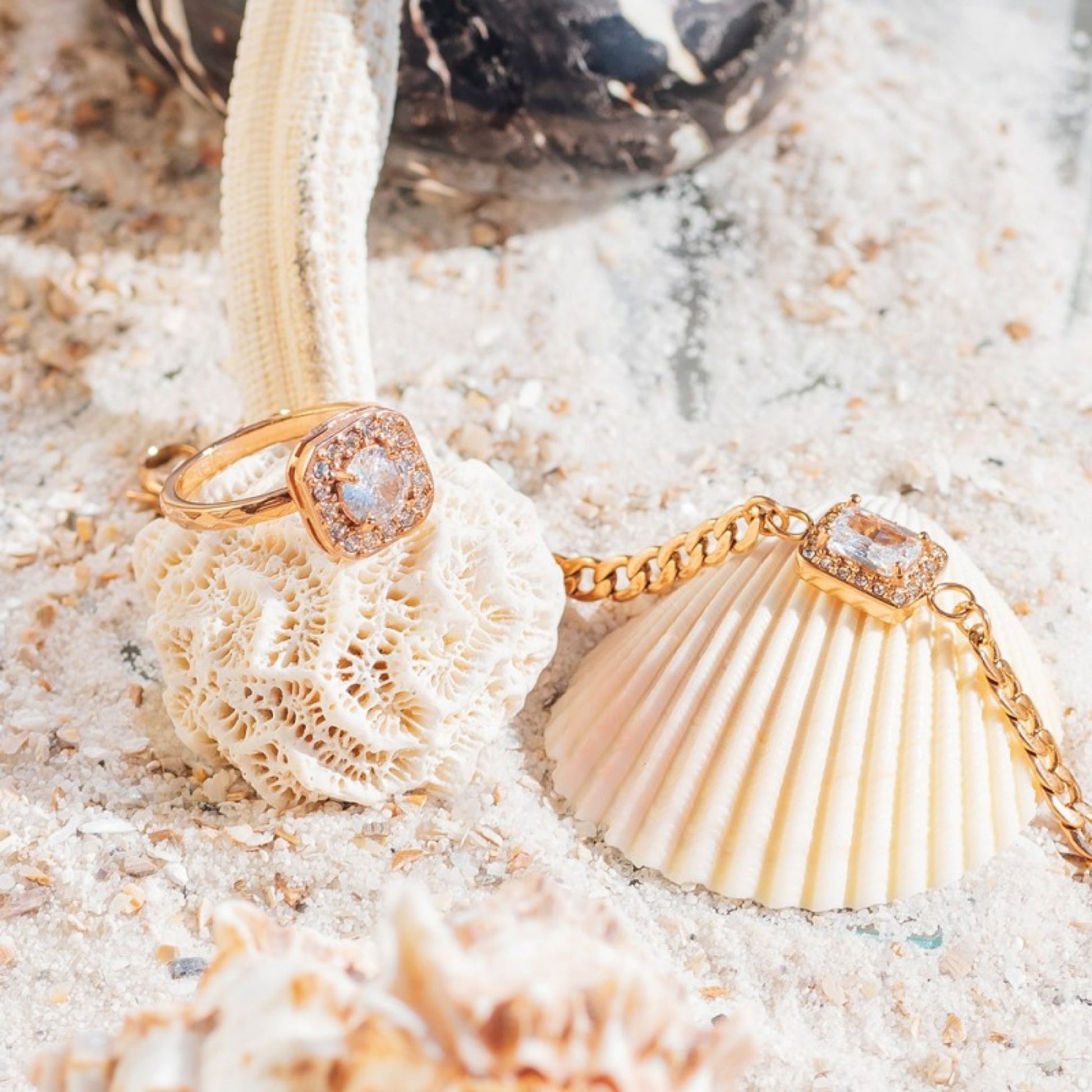 Een glamoureuze en luxueuze ring met een sprankelende centrale steen, omringd door een schitterende halo van kleinere steentjes. Deze tijdloze klassieker straalt elegantie en verfijning uit, perfect voor elke speciale gelegenheid.