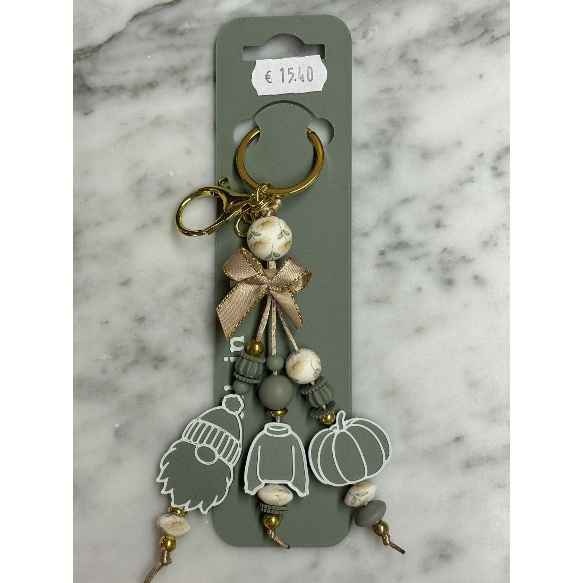 Onze Herfst Olijfgroen sleutelhanger combineert warme herfsttinten met een stijlvol olijfgroen accent, afgewerkt met gouden details. Dankzij de kralen, het strikje en de schattige figuurtjes is het een echte blikvanger aan je sleutelbos, handtas of boekentas.