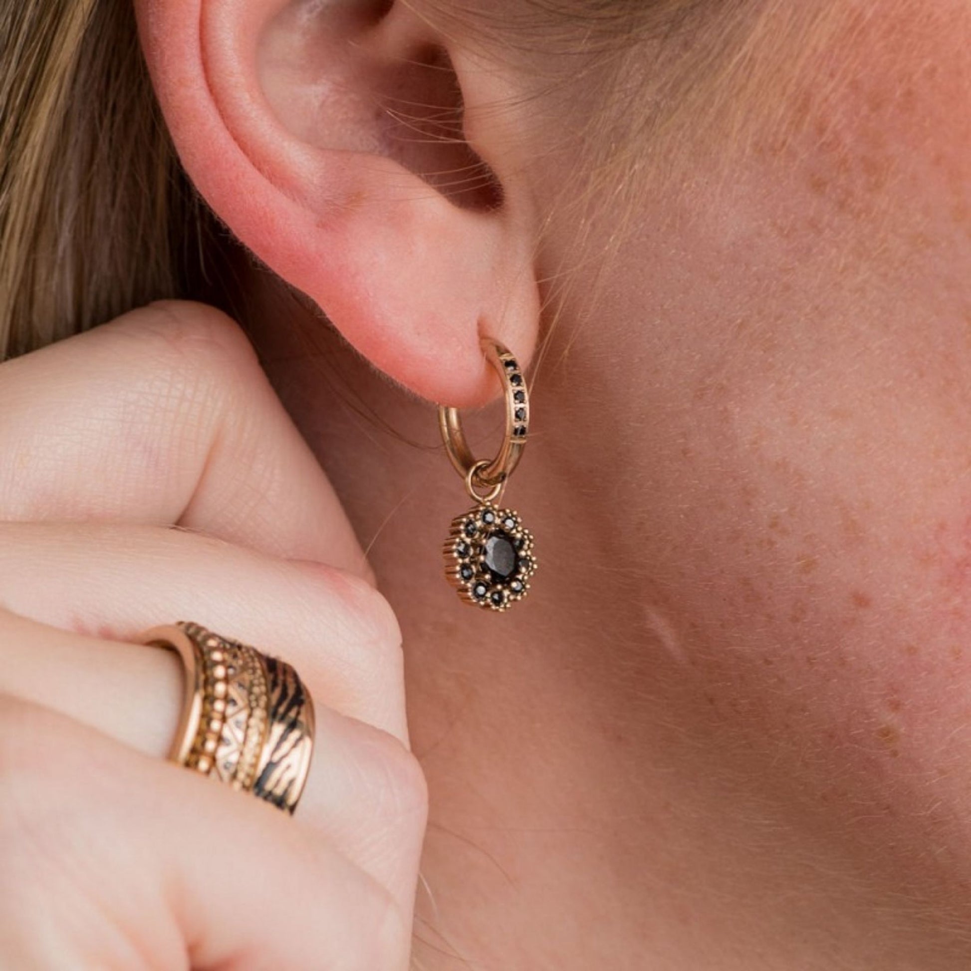 Trendy oorringen met een subtiele rij zwarte kristallen voor een mysterieuze en stijlvolle uitstraling. Draag ze solo voor een elegante look of combineer ze met oorbedeltjes voor een speels effect.