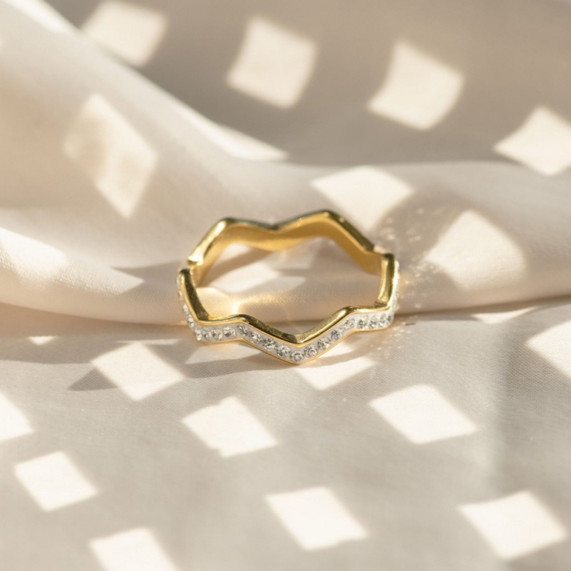 Een speelse en opvallende ring met een zigzagontwerp, verfijnd afgewerkt met sprankelende steentjes. Deze unieke ring combineert een moderne look met een vleugje glamour en is perfect als statement piece.