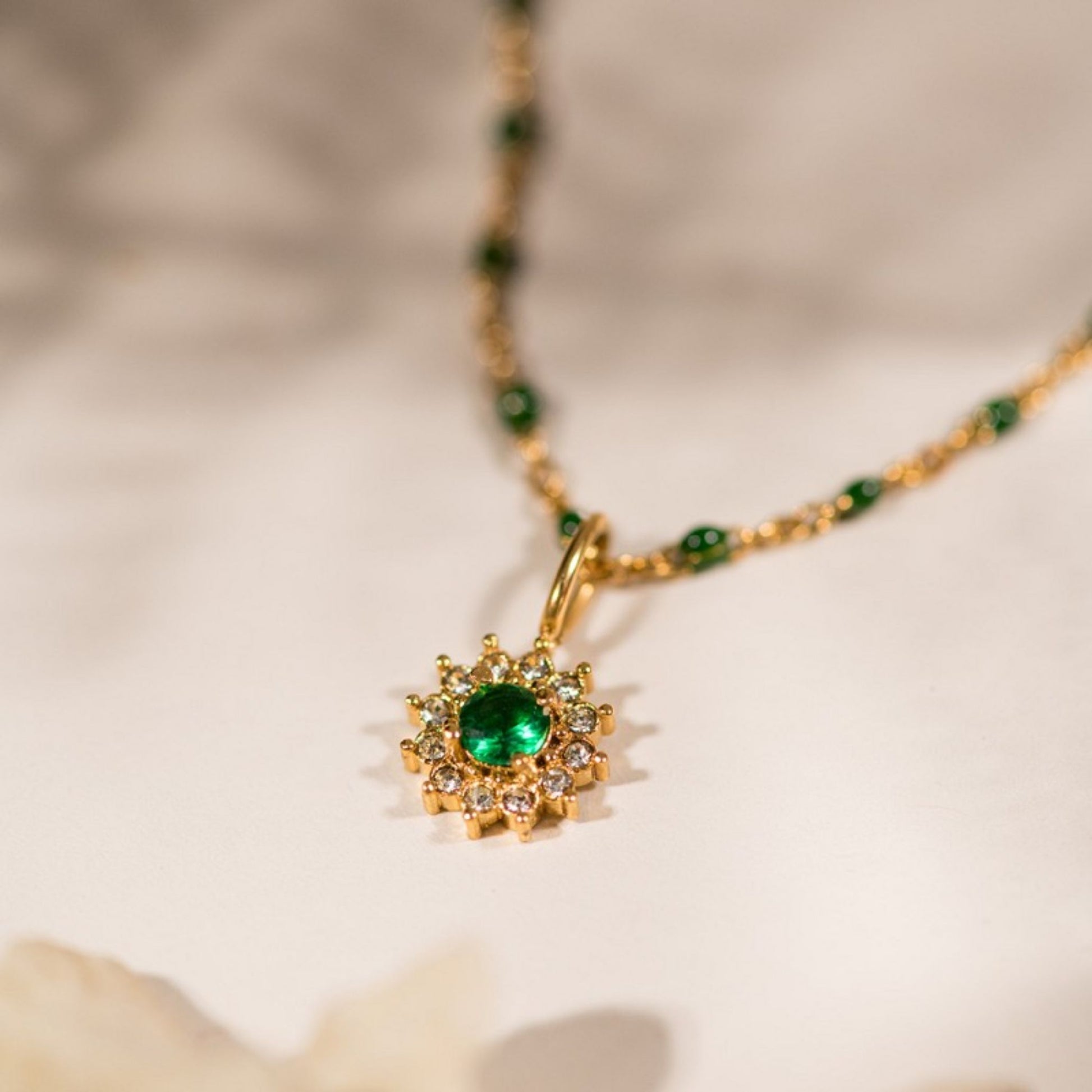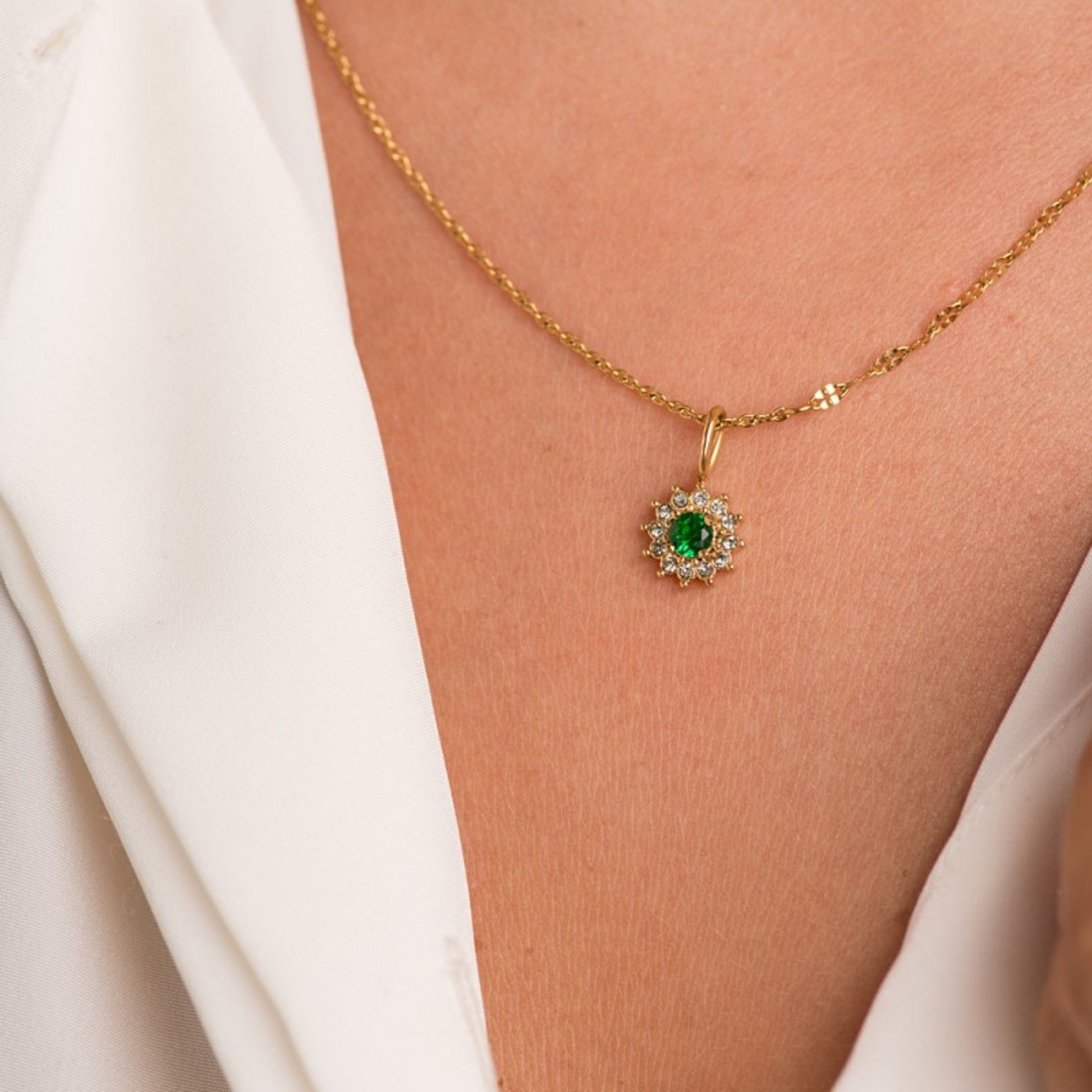 Voeg een vleugje elegantie toe aan je ketting met de Lucia Emerald hanger. Dit schitterende bedeltje heeft een sprankelende smaragdgroene steen, omringd door fijne zirconia steentjes die een luxe uitstraling geven. Perfect te combineren met jouw favoriete ketting voor een tijdloze en stijlvolle look.