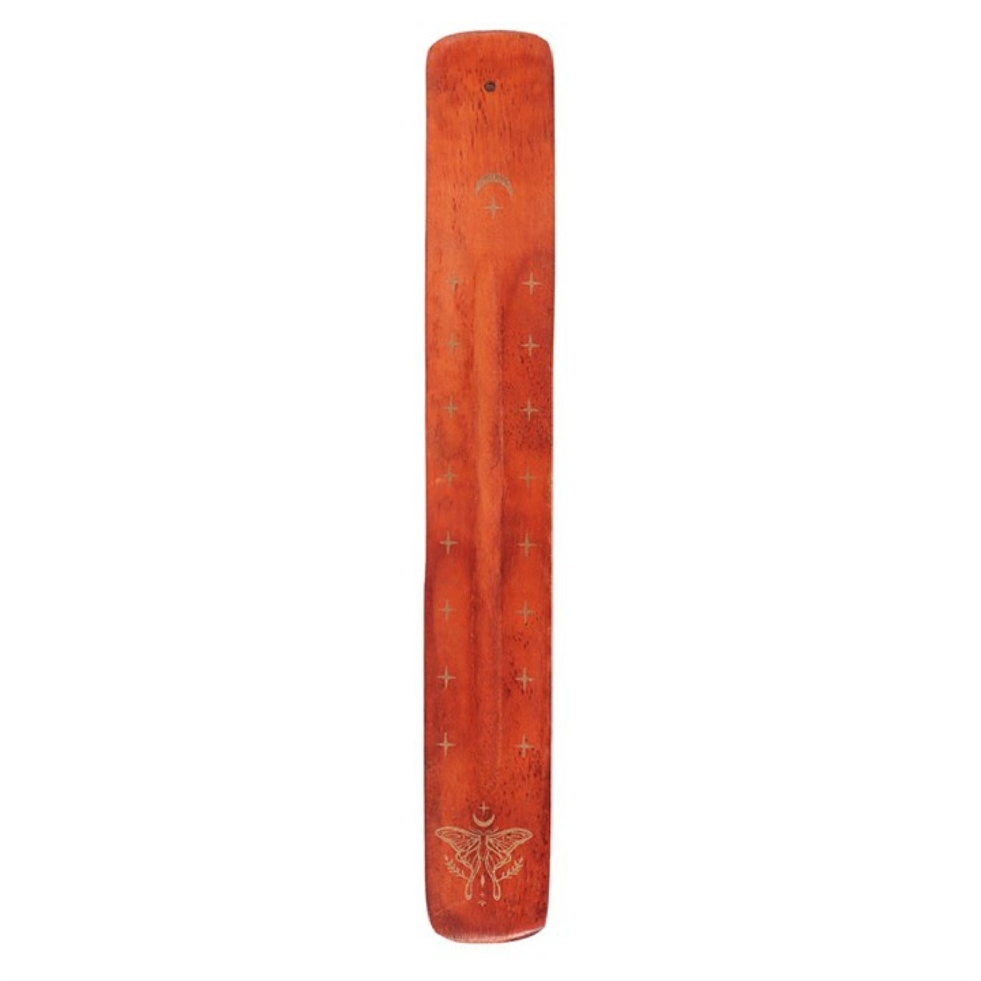 Deze betoverende variant op de klassieke houten wierookhouder is versierd met een sierlijk luna moth-ontwerp.