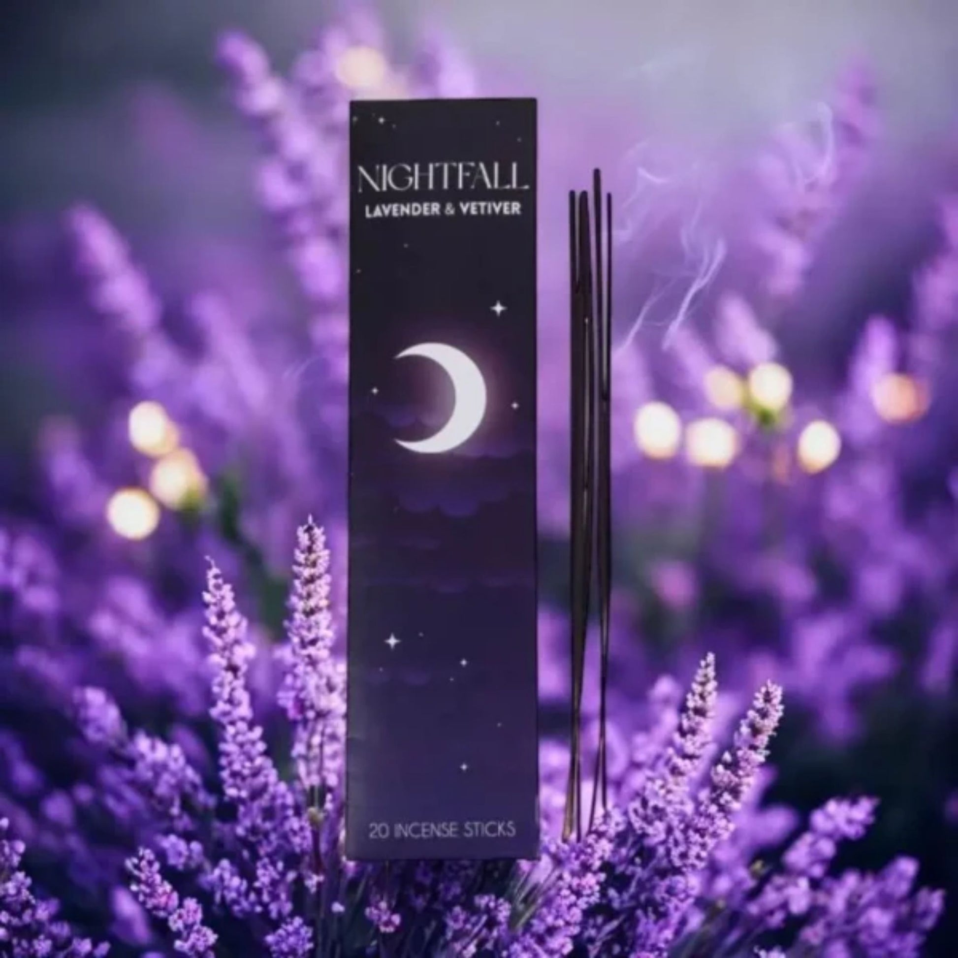 Ontspan en kom tot rust met de kalmerende geur van Nightfall. Deze handgerolde wierookstokjes combineren de zachte, bloemige tonen van lavendel met het aardse, licht rokerige aroma van vetiver. Perfect om de dag af te sluiten, een vredige sfeer te creëren en je voor te bereiden op een diepe, herstellende slaap.