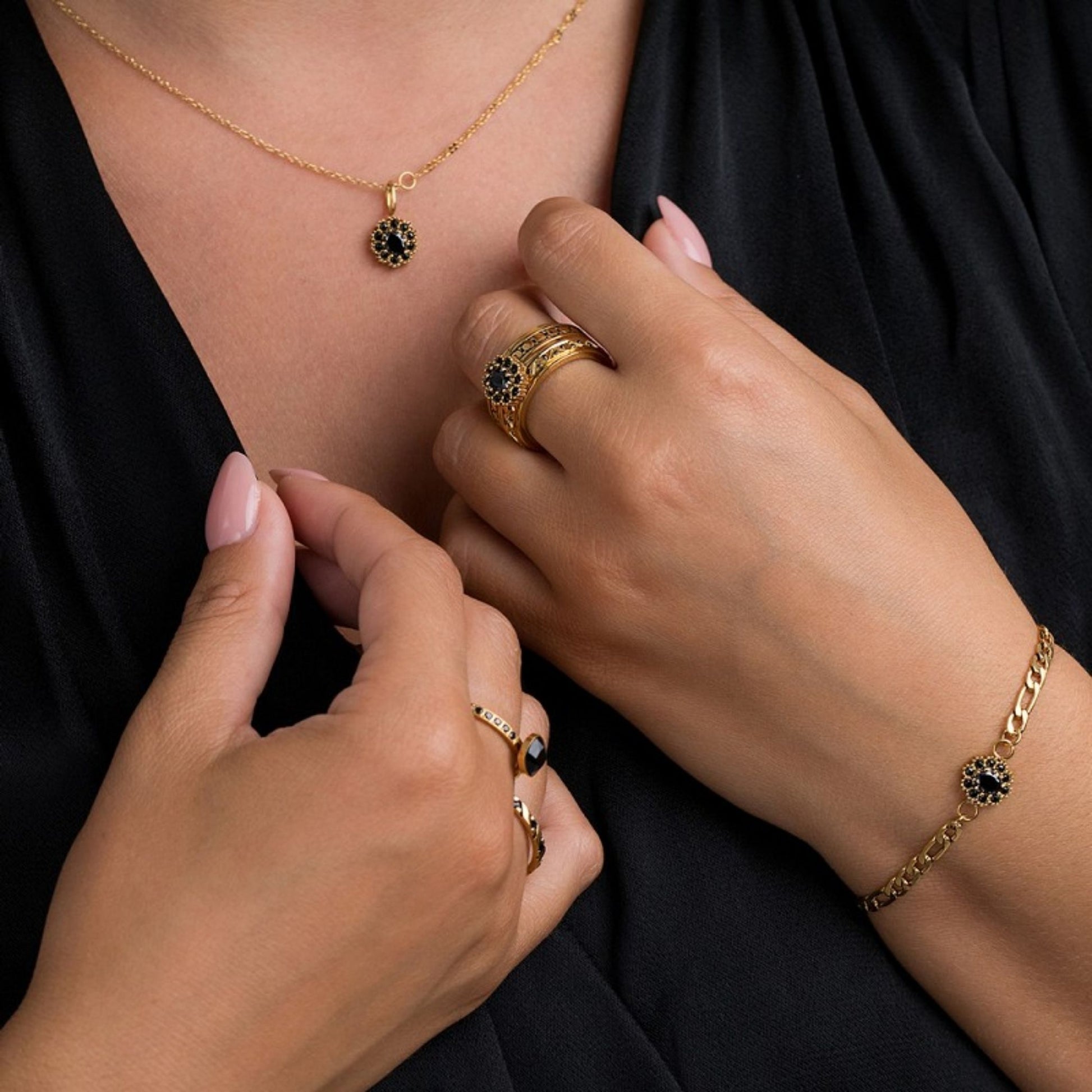 Een chique armband met een elegante zwarte steen, omringd door kleine zwarte steentjes voor een mysterieuze en luxueuze uitstraling. De verfijnde schakels zorgen voor een stijlvolle afwerking, perfect om solo te dragen of te combineren.