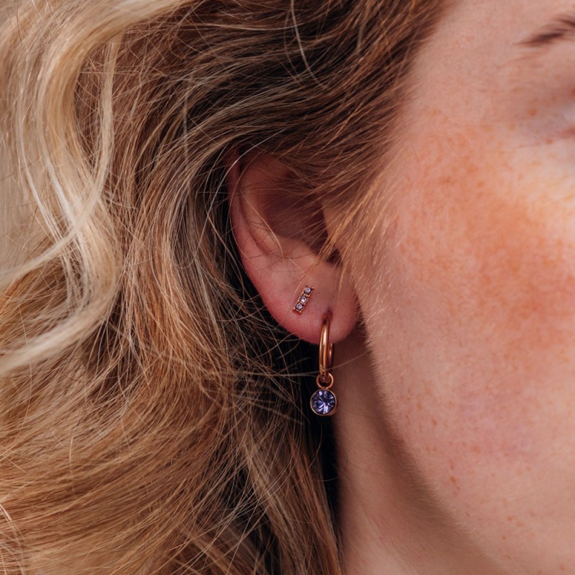 De Triple Stone Studs in rosé goud met tanzanite steentjes stralen elegantie en verfijning uit. De drie schitterende stenen in een verticale zetting geven een subtiele maar luxueuze uitstraling. Perfect om alleen te dragen of te combineren met andere oorbellen voor een stijlvolle earstack.