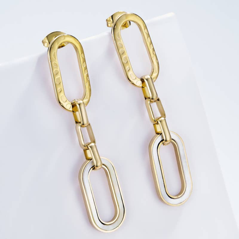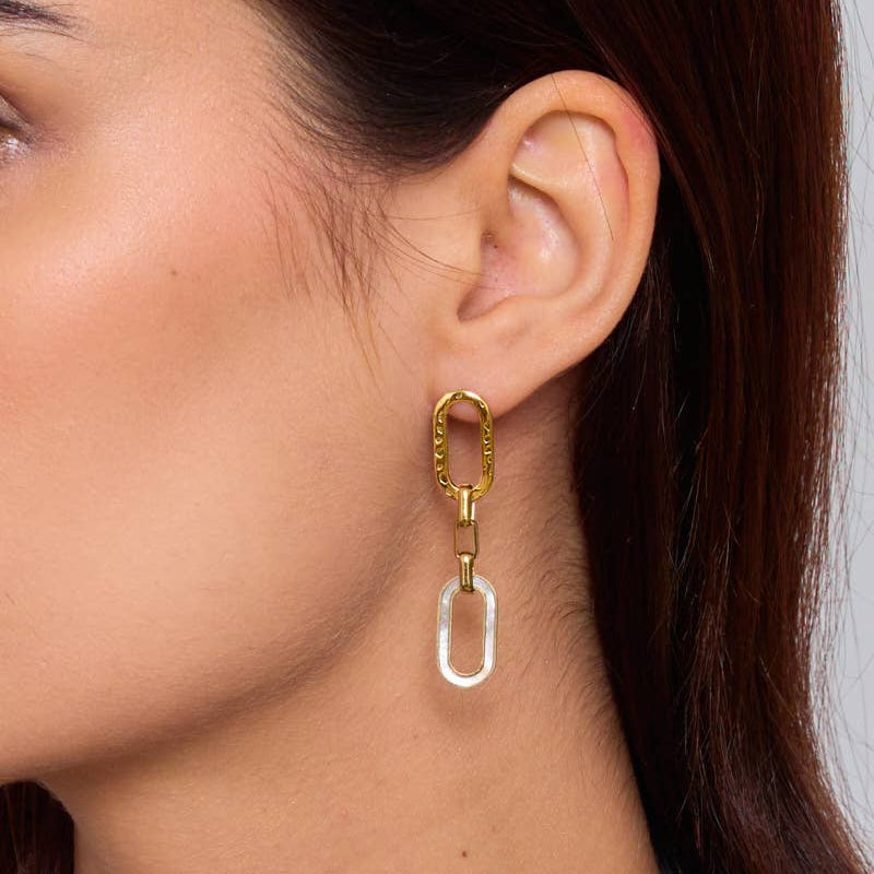 De Vera oorbellen combineren een trendy en edgy look met een vleugje elegantie. Het langwerpige schakelontwerp in goudkleurig metaal geeft een stoere, maar verfijnde uitstraling. Deze statement oorbellen zijn lichtgewicht en perfect om je outfit een moderne touch te geven. Ideaal voor zowel een casual als een chique gelegenheid!